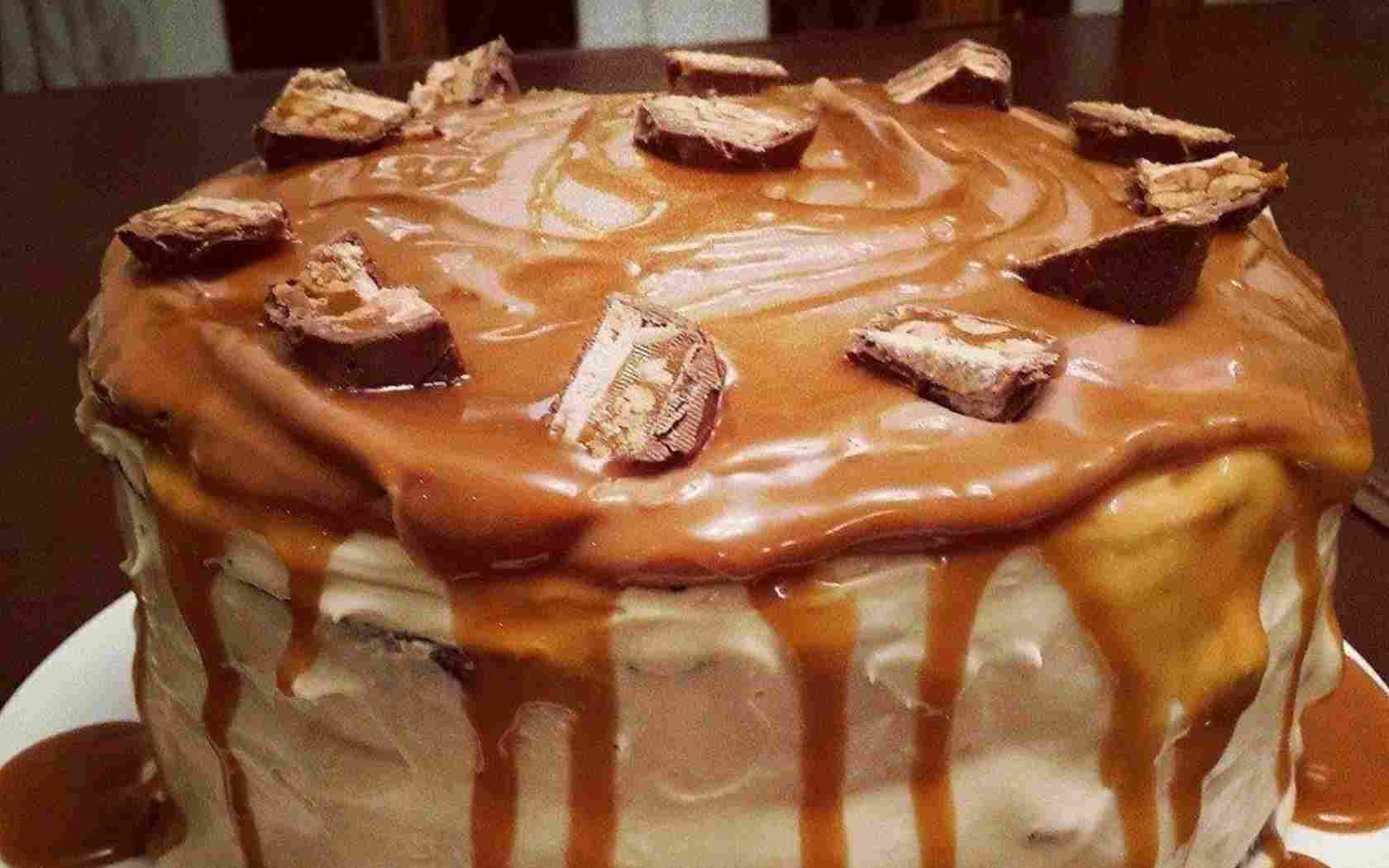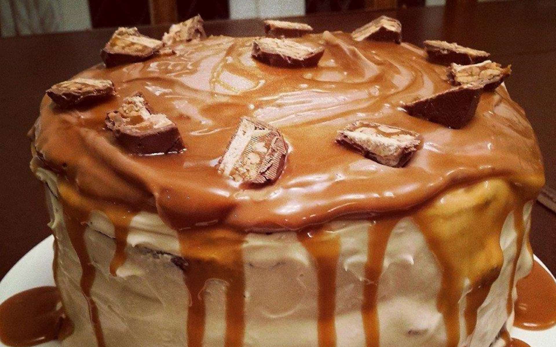 A flavourful chocolate cake topped with the popular English chocolate bar, Snickers.